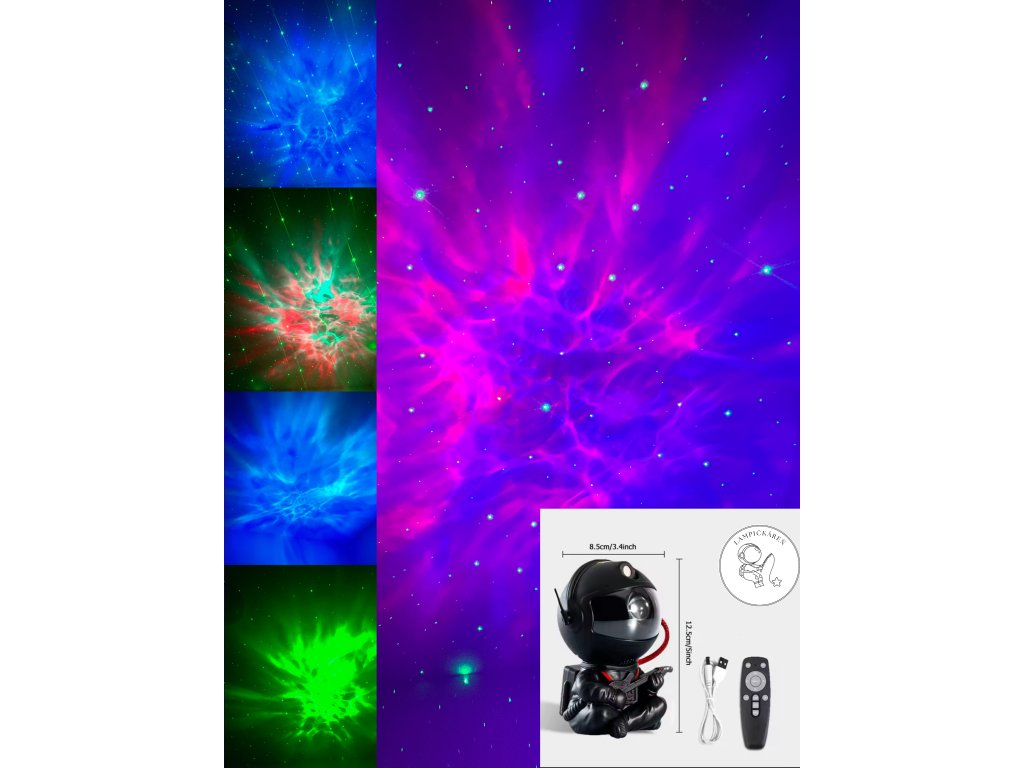 Astronaut vesmírny projektor premieta hviezdy a farebnú hmlovinu až v 8 režimoch. Dá sa nastaviť rýchlosť pohybu otáčania hmloviny, prípadne úplné zastavenie. Hlavu astronauta možno otáčať o 360°. Najlepší zážitok dosiahnete nasmerovaním astronautovej hlavy na strop. Potešiť ťa môže aj nastaviteľný časovač, ktorý po určenom čase Astronauta vypne.