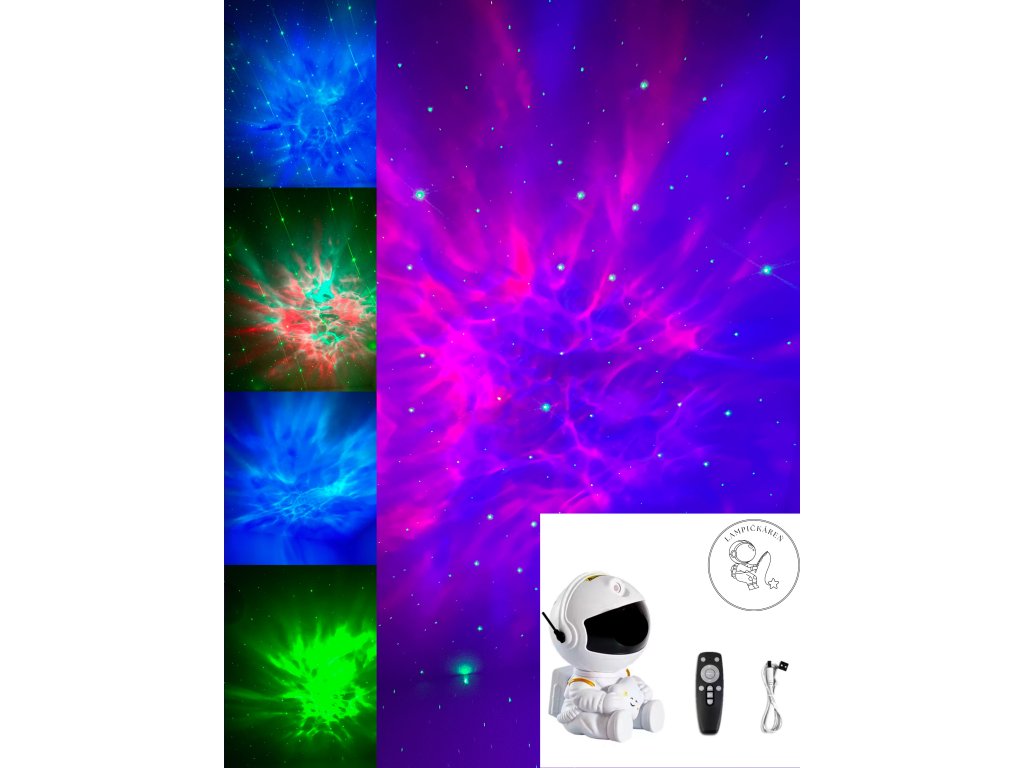 Nočná lampa, ktorá vyčaruje rozprávkový vesmír v tvojej izbe. Poteší deti aj dospelých. Astronaut s nastaviteľnou hlavou vytvára pokojnú atmosféru. Intenzita farebnej hmloviny a hviezd sa ovláda diaľkovým ovládaním, vďaka ktorému nemusíš vstať z postele.